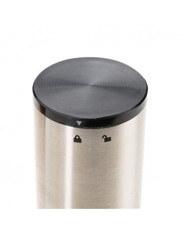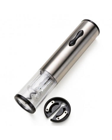 Saca rolhas elétrico com LED e cortador de lacre. Parte superior em alumínio e parte inferior acrílica, possui compartimento superior com tampa para 4 pilhas AA, painel com iluminação LED e botões para extração e remoção de rolhas.