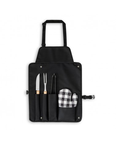 Kit churrasco composto por 4 utensílios: faca, garfo e pinça em aço inox e madeira de Seringueira e uma luva de cozinha. O estojo dobrável em 600D pode ser convertível em avental para sua proteção.