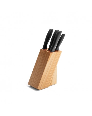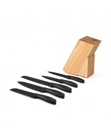 Suporte para facas em madeira de pinho. Incluso conjunto de 5 facas de cozinha: faca utilitária média, faca utilitária pequena, faca para vegetais, faca para pão e faca para carne. Peças em aço inox e PP, cabo com acabamento emborrachado.