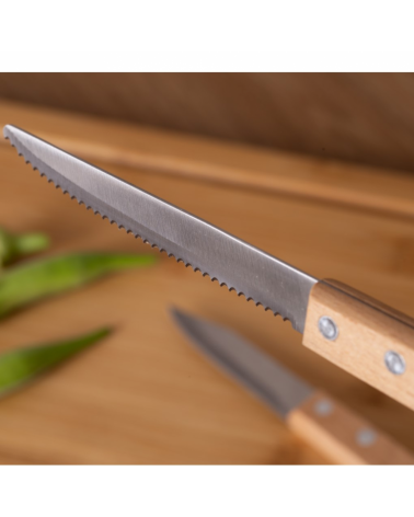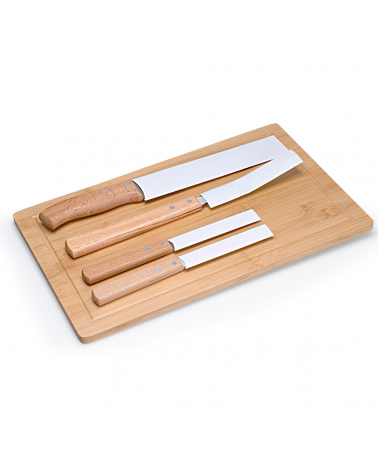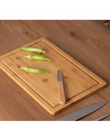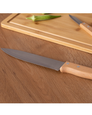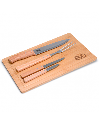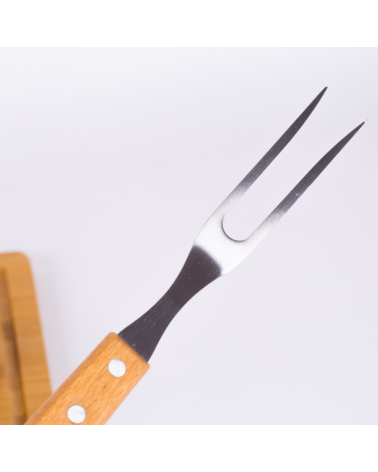 Kit churrasco, contendo 5 peças: Garfo trinchante; Faca para carne 8¨; Faca para churrasco.; Faca para vegetais. Tábua de bambu com 1,2 cm de espessura Obs.:Os componentes de madeira e bambu poderão apresentar tonalidades diferente.
