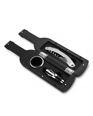 Kit Vinho 4 peças, contendo: Estojo modelo garrafa; Saca Rolha de metal; Corta gotas de metal; Bico para servir de metal com tampa acoplada.