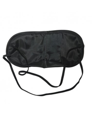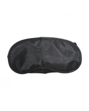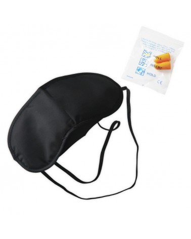 Máscara para descanso em cetim estofado com alças em nylon e par de protetores auriculares.