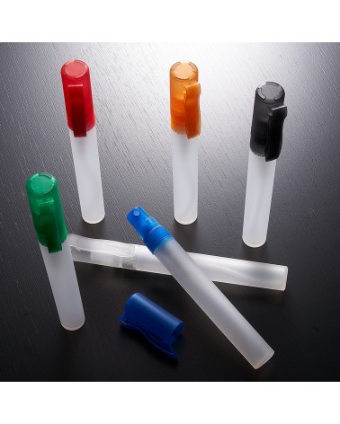 Spray higienizador 10ml plástico com tampa e bastão branco fosco.