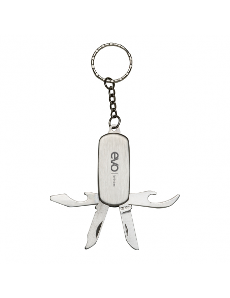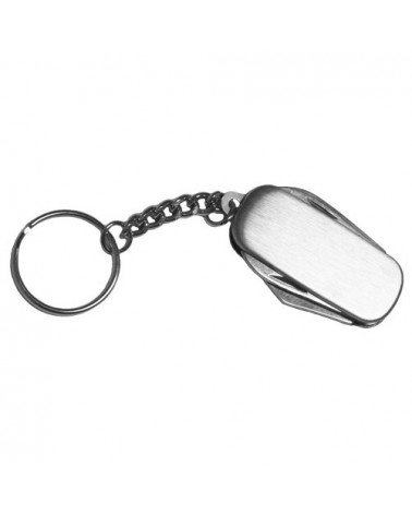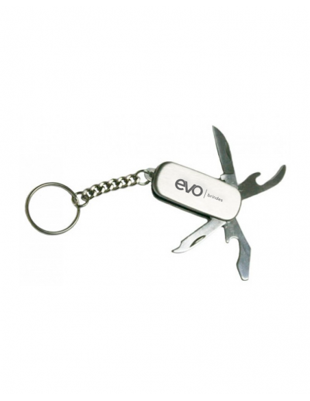 Chaveiro plástico com a parte interior de metal canivete multifunções, com 5 funções.