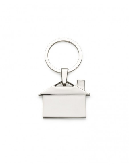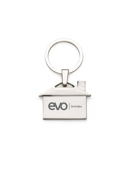 Chaveiro metálico brilhante formato casa.