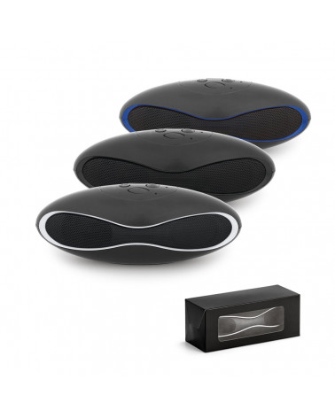 Caixa de som em plástico emborrachado com detalhes em poliéster.