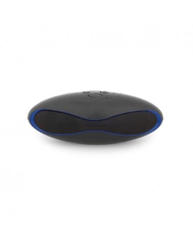 Caixa de som bluetooth em plástico com detalhes em poliéster e alça plástica.