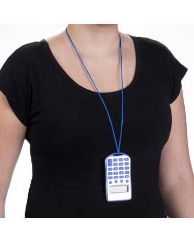 Calculadora plástica retangular com cordão de 8 dígitos prata com cordão e acessórios coloridos, acompanha 1 bateria AG10 para funcionamento.
