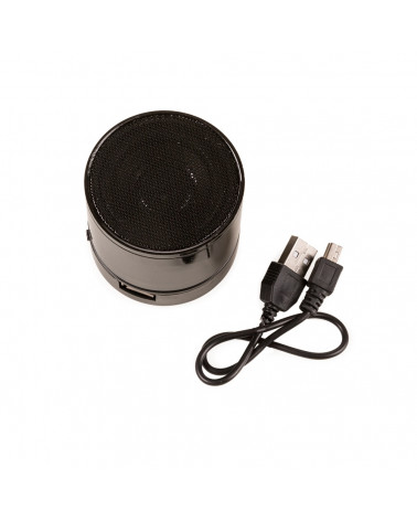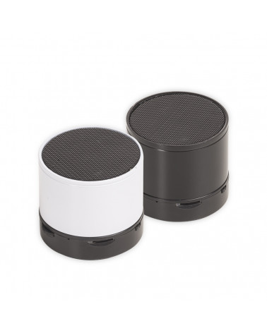 Caixa de som em plástico emborrachado com detalhes em poliéster.