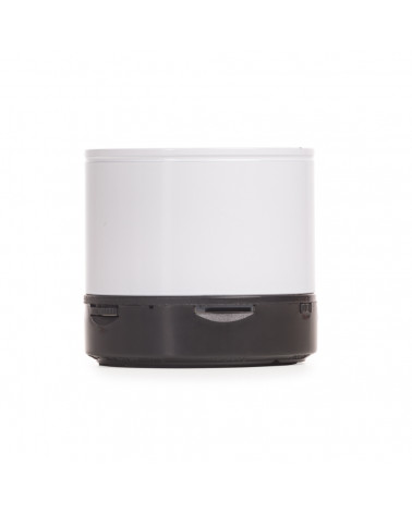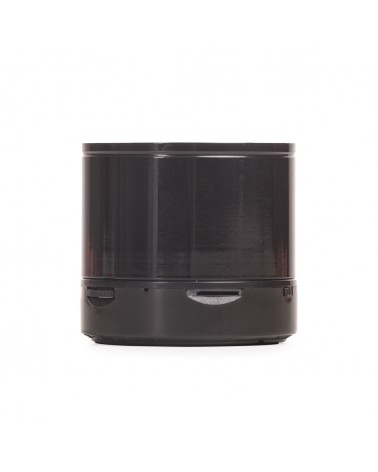 Caixa de som bluetooth em plástico com detalhes em poliéster e alça plástica.