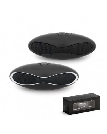Caixa de som em plástico emborrachado com detalhes em poliéster.