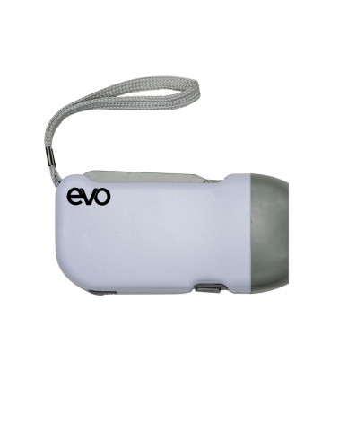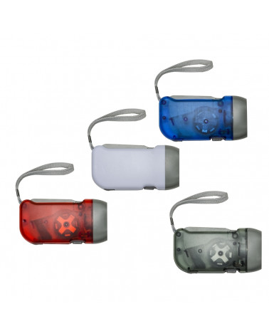 Lanterna de alumínio com alça. Possui um led acionado através do botão emborrachado e alça para transporte em nylon.