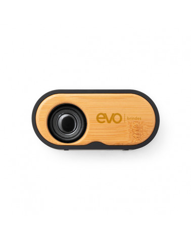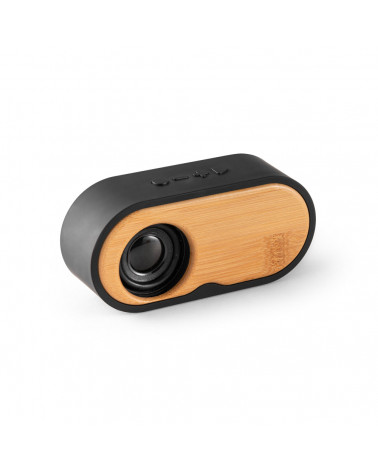Caixa de som portátil em ABS reciclado e bambu. Com potência de 3W e transmissão por bluetooth 5.0 e função de rádio.