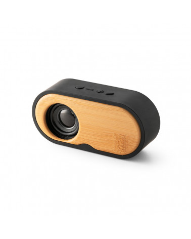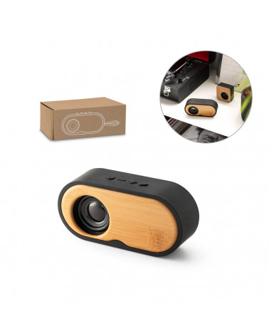 Caixa de som portátil em ABS reciclado e bambu. Com potência de 3W e transmissão por bluetooth 5.0 e função de rádio. Tempo de reprodução até 5h com uma bateria de 1200 mAh. Fornecido em caixa presente de papel craft. 135 x 40 x 65 mm