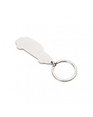 Chaveiro metálico em Formato retangular com bordas arredondadas.