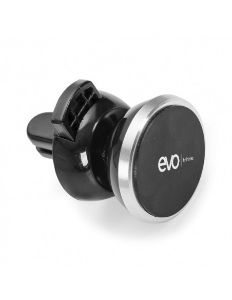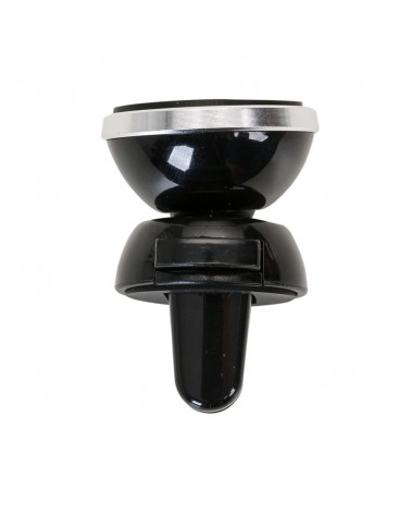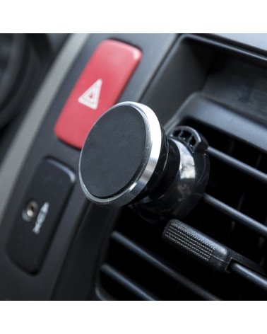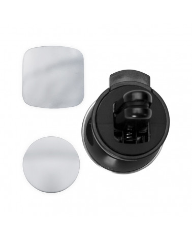 Suporte veicular para celulares com fixação magnética e pinça para fixação na grade do ar-condicionado. Acompanha duas fichas metálicas para fixação do celular no ímã.